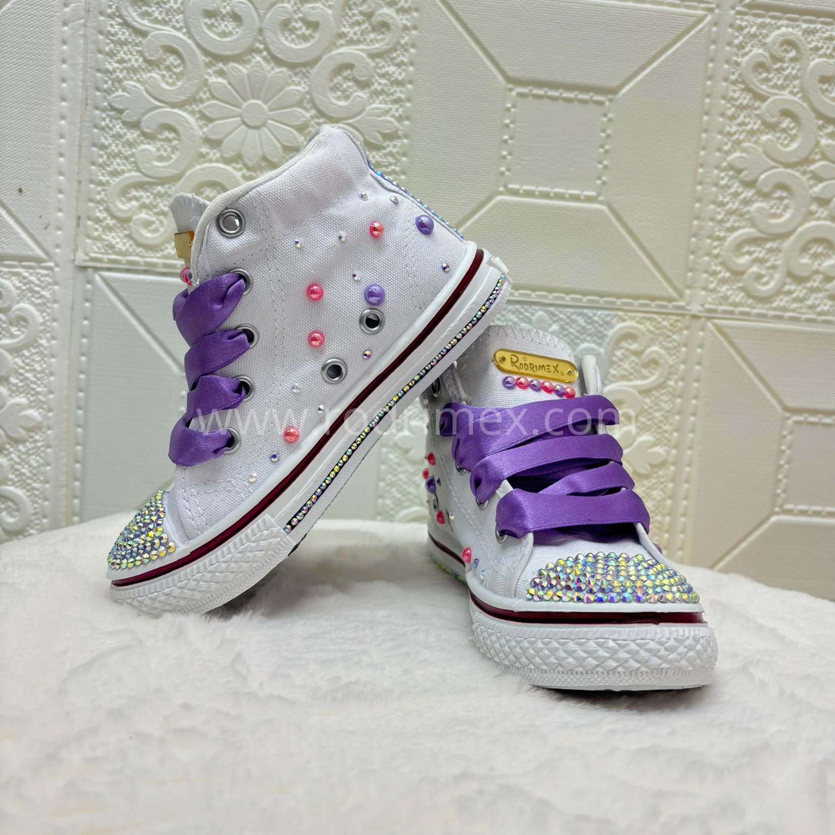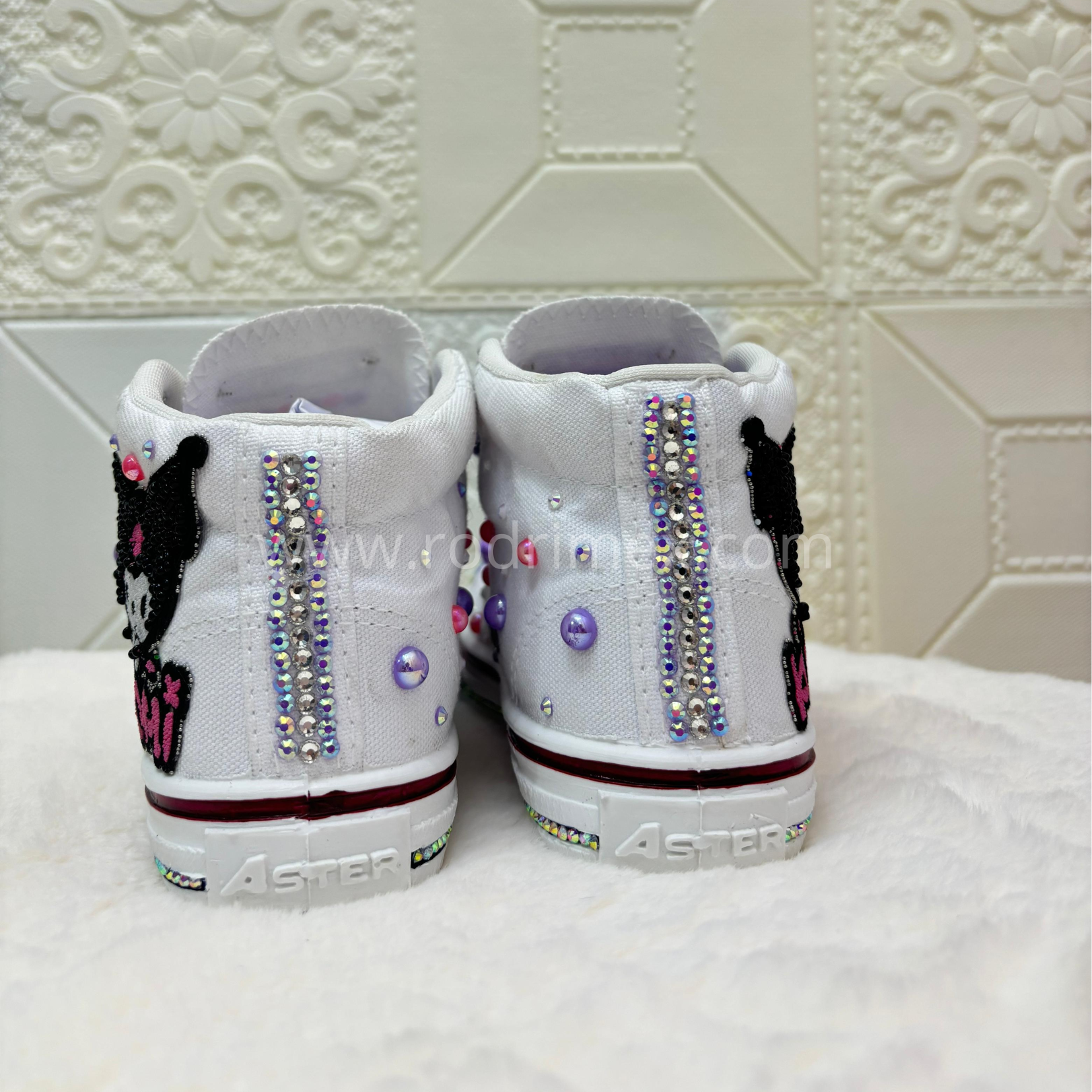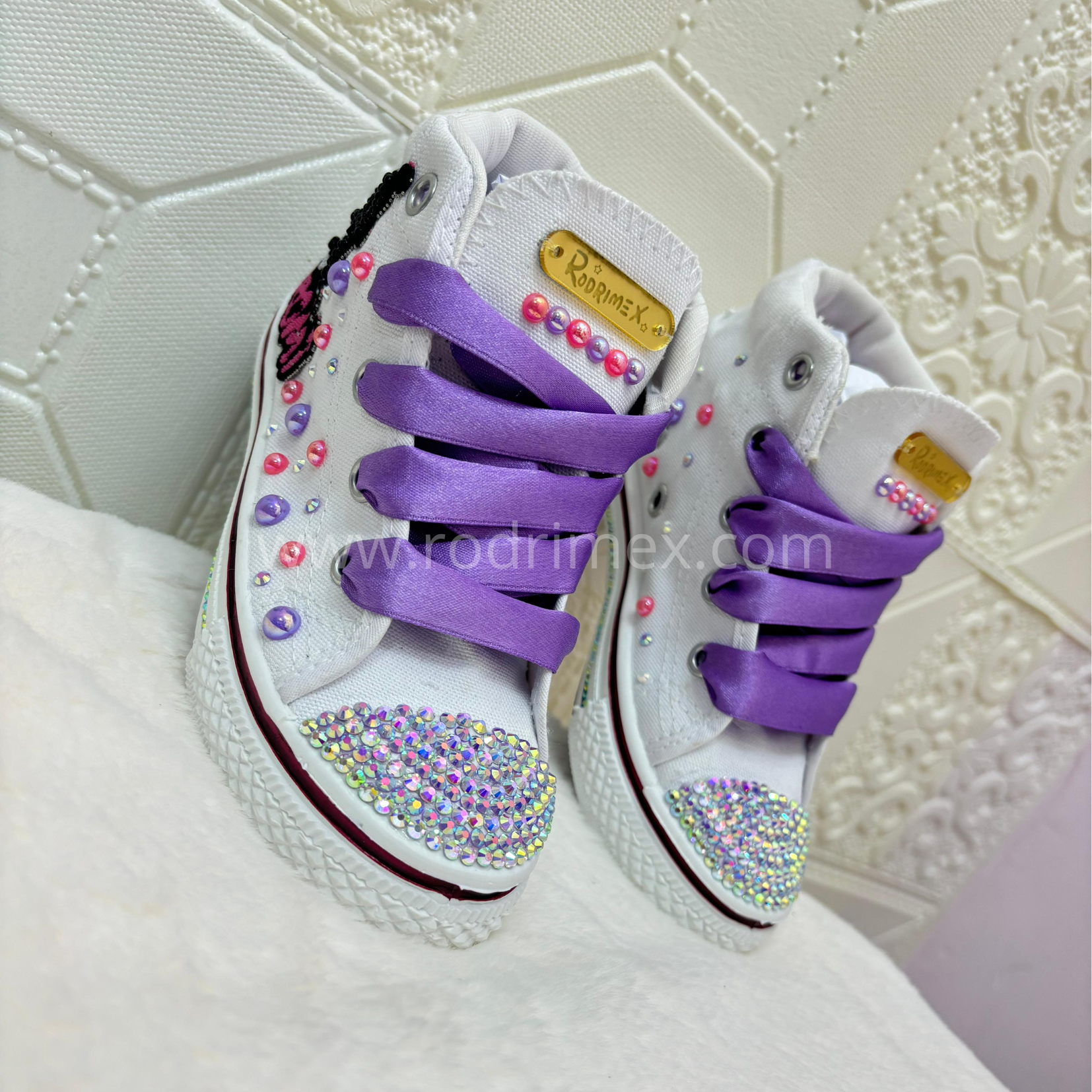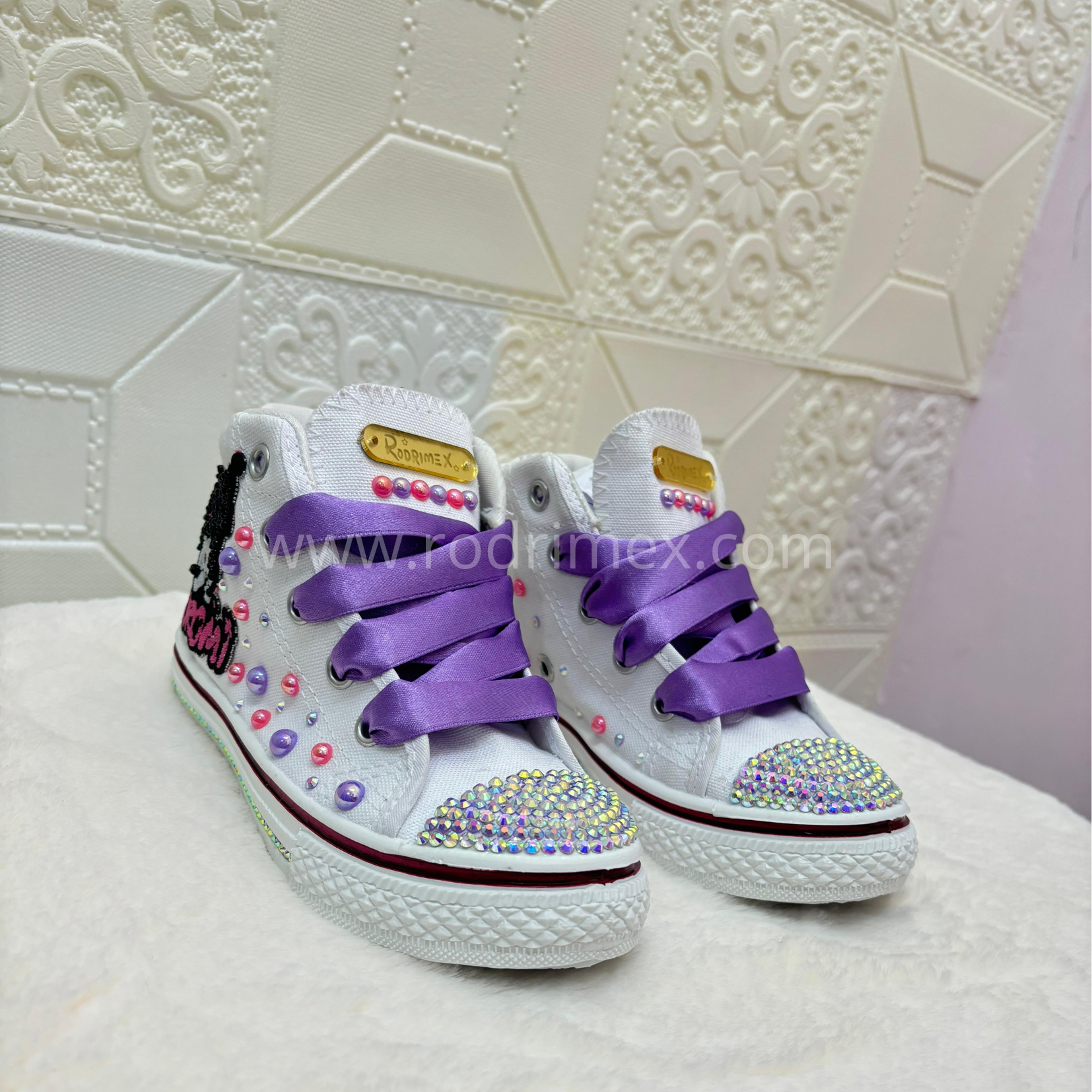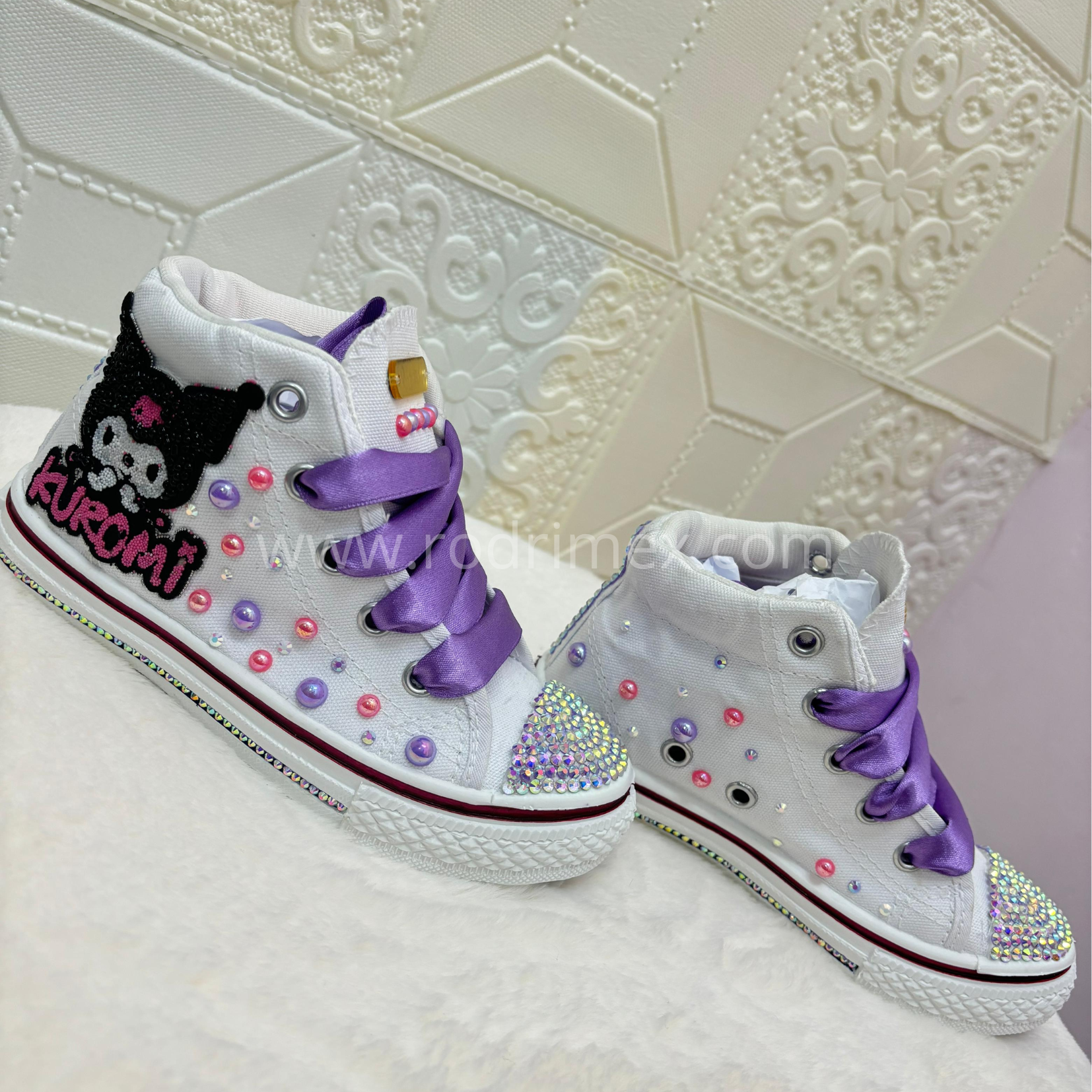 Las más traviesas y coquetas tienen su calzado ideal 👟💜. Estas zapatillas blancas están decoradas con brillos, perlas de colores y detalles únicos que iluminan cada paso. Su toque especial está en los cordones satinados morados , combinados con la figura bordada de Kuromi , el personaje más rebelde y tierno. Además, puedes personalizarlas con el nombre de tu engreída para hacerlas completamente únicas. 🖤🎀
