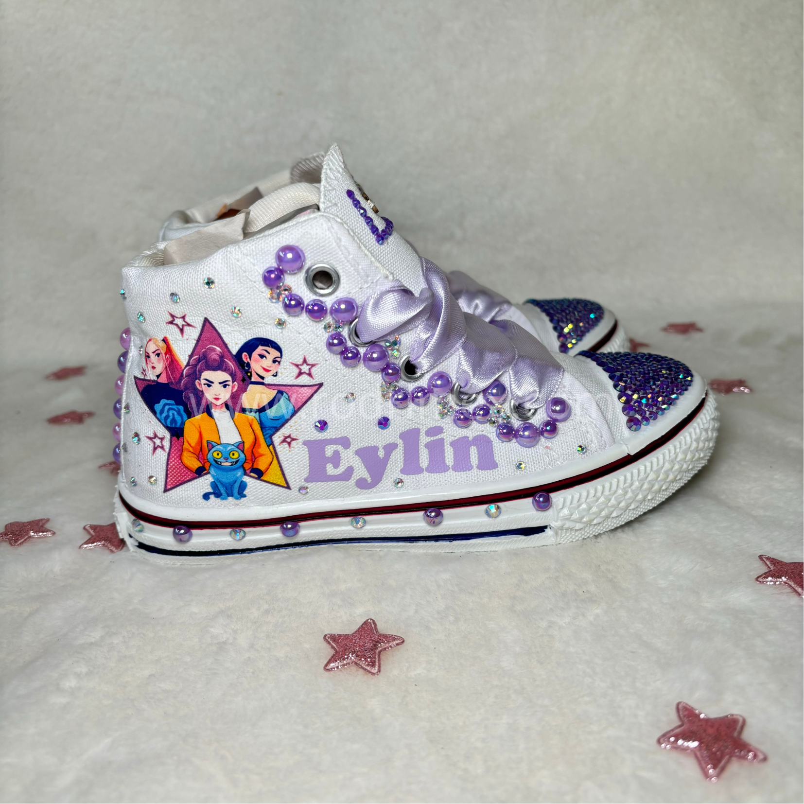 El brillo y la ternura se unen en este diseño único 👟💖. Estas zapatillas blancas están trabajadas con pedrería, decoradas con la tematica de las guerreras k-pop, que le da un toque mágico y encantador. Los cordones de cinta satinada  lila aportan elegancia y dulzura, convirtiéndolas en el calzado perfecto para las más coquetas. 🌸✨
