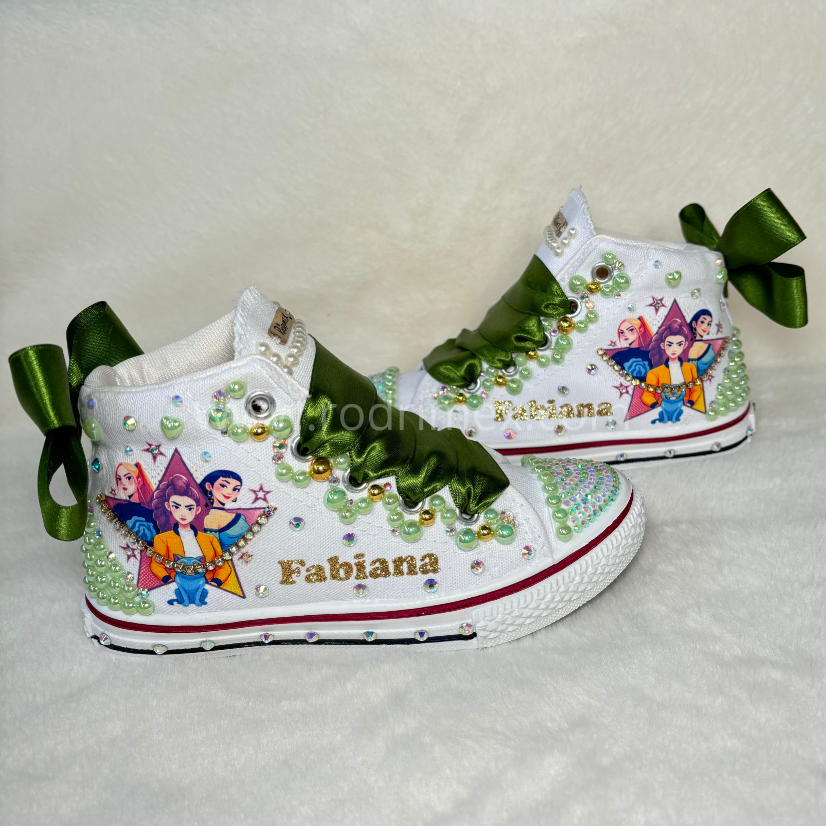 El brillo y la ternura se unen en este diseño único 👟💖. Estas zapatillas blancas están trabajadas con pedrería, decoradas para una fiesta de promoción. Los cordones de cinta satinada aportan elegancia y dulzura, convirtiéndolas en el calzado perfecto para las más coquetas. 🌸✨